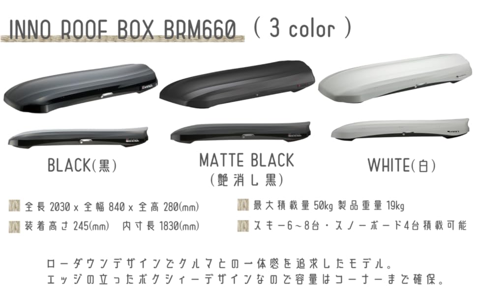 - 軽ハイトワゴン・ジムニー・ハイエースなど、ルーフ幅の広い角型のクルマに似合う、シンプルなスクエアデザインのルーフボックス