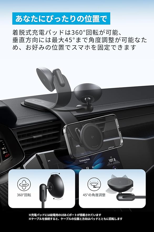 - 着脱式充電パッドは360°回転、最大45°まで角度調整が可能なため、お好みの位置でスマホを固定できます