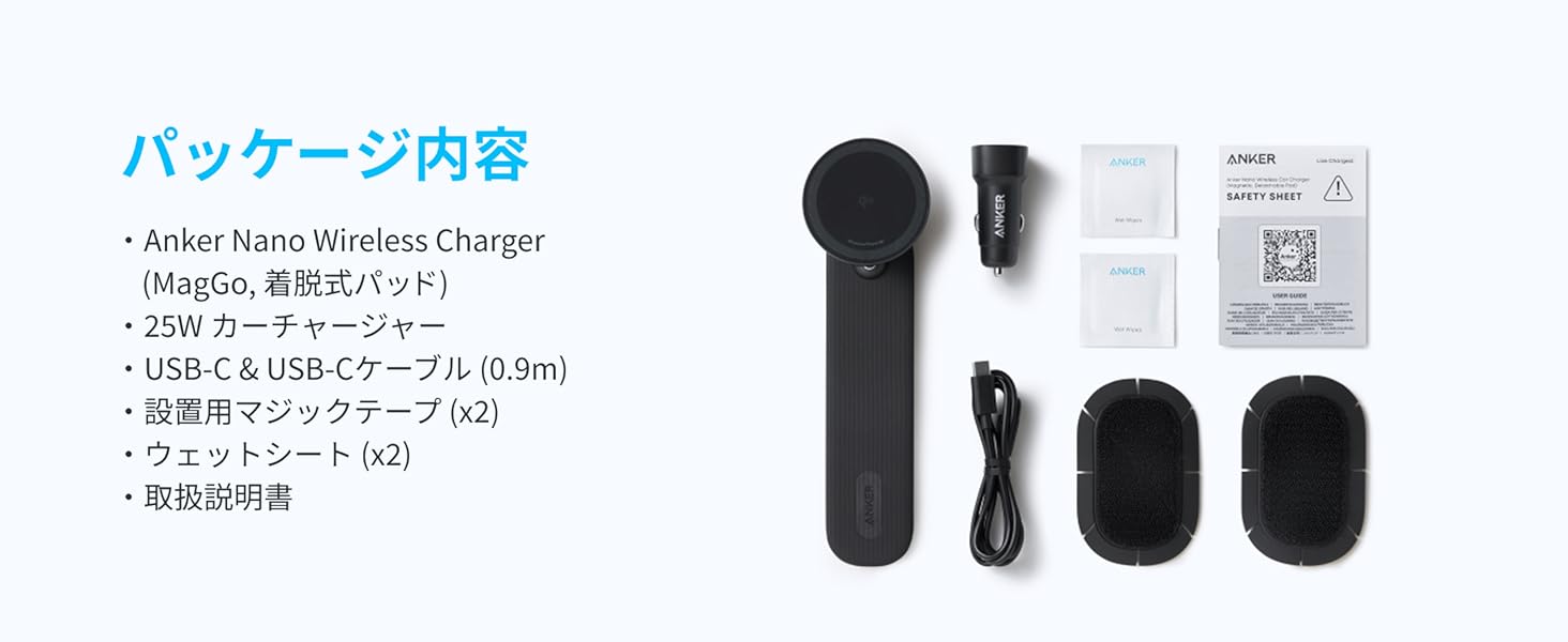 Anker Nano Wireless Charger (MagGo・着脱式パッド)with Car Chargerのパッケージ内容は次のとおりです。