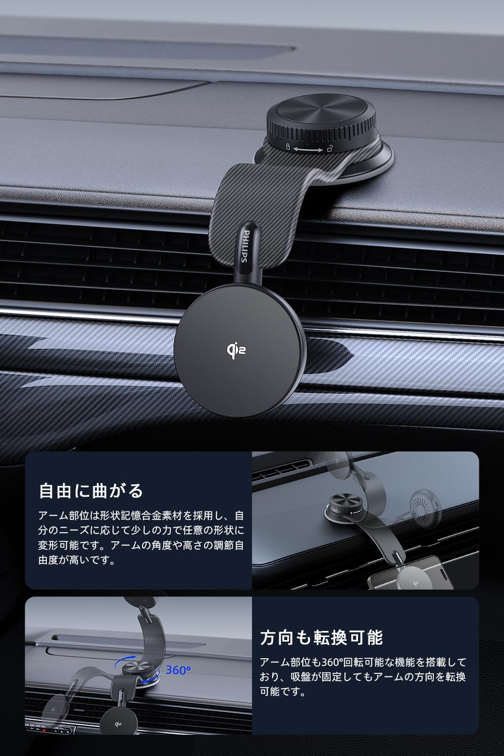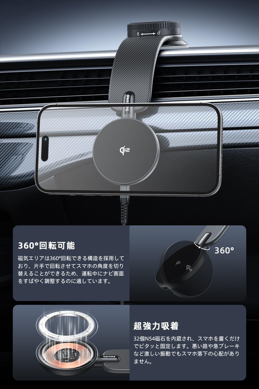 Philips『スマホホルダー 15W急速充電対応(3M粘着テープ・超強力マグネット・角度調整可能)』の特徴は次のとおりです。