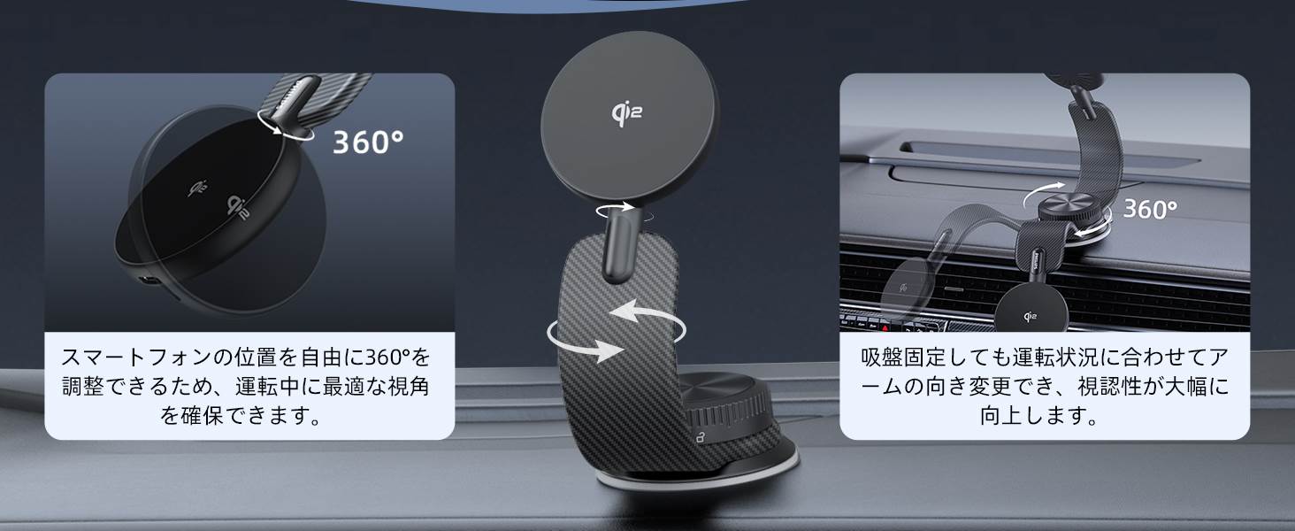 - 着脱式充電パッドは360°回転、最大45°まで角度調整が可能なため、お好みの位置でスマホを固定できます